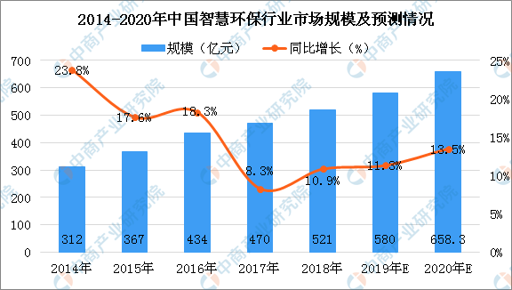 目前,我國環境污染問題已經成為國家和社會關注的焦點,傳統的污染治理方式在預防性、及時性以及精準性等方面有所欠缺。在互聯網技術快速發展下,運用大數據、云計算和物聯網等手段智能化治理污染與保護環境,成為環保行業未來發展的新方向。到2020年,中國智慧環保行業市場規模將突破650億元,市場前景十分廣闊。